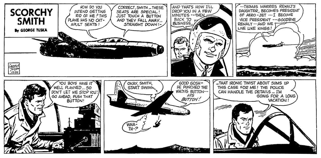 Je viens de terminer le chapitre 9 de mon feuilleton sur la BD d’aviation américaine « Scorchy Smith » : Après que nos amis de l’AP Features ont réussi à évincer Al Hollingsworth (voir HOP ! n° 159), c’est George Tuska qui est engagé pour dessiner « Scorchy Smith » de 1954 à 1959. La liste des créateurs s’allonge donc avec l’arrivée de l’editor et encreur Ed Fleming.